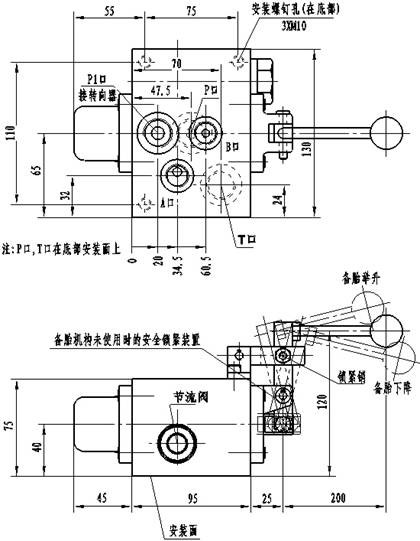 該閥在中位時(shí),P口到P1口接轉(zhuǎn)向器供汽車行駛轉(zhuǎn)向用。這時(shí)將換向閥操縱桿加以鎖緊裝置防止滑閥竄動(dòng),保證汽車安全行駛。當(dāng)操作換向閥手柄在位置Ⅰ時(shí)P口到B口接油缸大腔,此時(shí)備胎機(jī)構(gòu)下降,油缸小腔由A口到P1口利用轉(zhuǎn)向器中位的H型機(jī)能排油流回油箱。當(dāng)操作換向閥在位置Ⅱ時(shí)P口到A口接油缸小腔,此時(shí)備胎機(jī)構(gòu)舉升,油缸大腔由B口到T口排油流回油箱。
