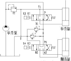 在舉升過程中,舉升泵輸入的液壓油全流量進(jìn)入舉升缸;在頂蓋開啟、關(guān)閉過程中,舉升泵輸入的液壓油經(jīng)過分流閥后,分流出一部分(30L/min)進(jìn)入頂蓋油缸,其余的液壓油流回油箱。