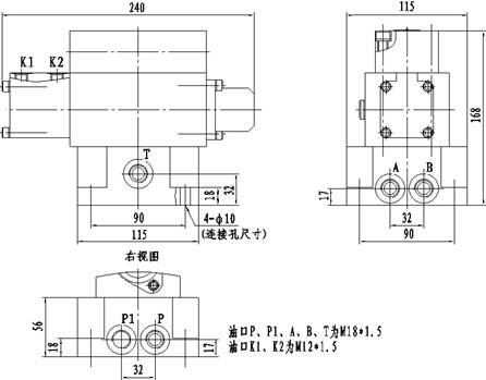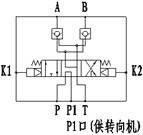 QDZ9114型氣控閥組在中位時,P口與P1口相通,壓力油由P口進入,經過P1口可向其它機構提供油源。當壓縮空氣進入K1口或K2口時,該閥處于換向位置,壓力油由P口經過A口(或B口)進入油缸的一腔,油缸另一腔的油液由B口(或A口)經過T口回油箱,控制油缸的伸縮;當切斷進入該閥的壓縮空氣時,閥芯在彈簧力的作用下回到中位,雙向液控單向閥(液壓鎖)關閉,鎖定油缸的伸縮。該閥的工作原理示意圖如下:
