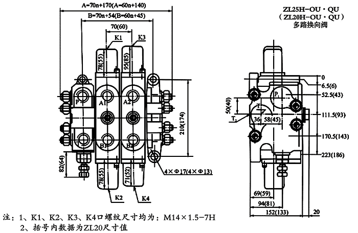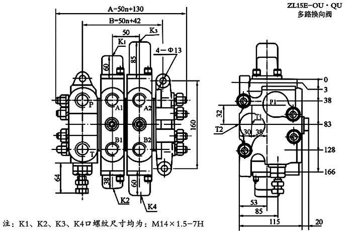 ZL15型液控多路閥的外形及安裝連接尺寸: