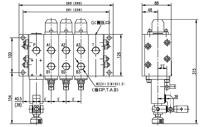 外形及安裝連接尺寸: ZS3-L※※-OW·OT/FLD型多路換向閥(10通徑E=40;15通徑E=45;N為換向閥片數(shù))括號(hào)內(nèi)為10通徑尺寸