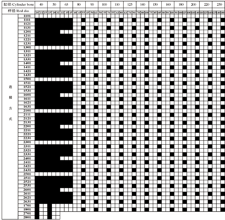 用戶選型完后,請將選用的主參數(shù)(缸徑、活塞桿徑)及連接方式編號與下表進行核對,以免選型差錯。