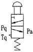 在氣控限位閥的限位桿行程范圍內(nèi)(即Pa口的閉合—開啟—閉合)實(shí)現(xiàn)車廂下降—舉升—下降往復(fù)變化過程,使車廂產(chǎn)生輕微抖動(dòng)有利于將車廂內(nèi)的殘留物體卸掉。在連接示意圖(2)中搬動(dòng)操縱氣閥的手柄換向至工作位置(Pq口與A口連通)將壓縮空氣經(jīng)氣控限位閥進(jìn)入舉升閥的氣缸K1口實(shí)現(xiàn)液壓缸上升。當(dāng)車廂舉升到最大轉(zhuǎn)角位置時(shí),限位機(jī)構(gòu)將氣控限位閥的限位桿壓下切斷其進(jìn)氣口(Pq口與Pa口是斷開),Pa口與Tq口接通使舉升閥氣缸內(nèi)的壓縮空氣由氣控限位閥排入大氣。這時(shí)舉升閥回到中位,P口經(jīng)A口與T口連通回油,B口關(guān)閉車廂處于最高舉升位置狀態(tài),該閥的工作原理示意圖如下。