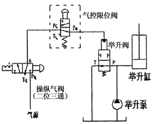 QXF型氣控限位閥的原始位置Pq口與Pa口是連通的(常開式結(jié)構(gòu),)。在連接示意圖(1)中搬動(dòng)操縱氣閥的手柄換向至工作位置(Pq口與A口連通)將壓縮空氣經(jīng)氣控限位閥進(jìn)入舉升閥氣缸使舉升閥換向?qū)崿F(xiàn)液壓缸上升。當(dāng)車廂舉升到最大轉(zhuǎn)角位置時(shí),限位機(jī)構(gòu)將氣控限位閥的限位桿壓下切斷其進(jìn)氣口(Pq口與Pa口是斷開),Pa口與Tq口接通使舉升閥氣缸內(nèi)的壓縮空氣由氣控限位閥排入大氣。這時(shí)舉升閥P口與T口瞬間連通,舉升缸即下降一段距離(車廂舉升轉(zhuǎn)角變小),隨車廂舉升轉(zhuǎn)角變小氣控限位閥的限位桿恢復(fù)原始狀態(tài)同時(shí)壓縮空氣經(jīng)該閥再次進(jìn)入舉升閥氣缸使舉升缸,上升(車廂再次舉升到最大轉(zhuǎn)角位置)。
