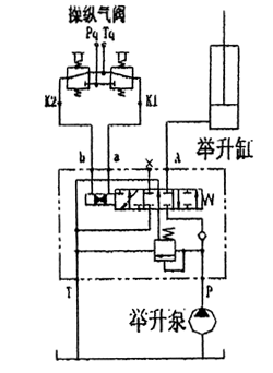 當(dāng)氣控口a接通氣源,推動(dòng)氣控?fù)Q向閥的閥芯至舉升位置使車廂舉升。